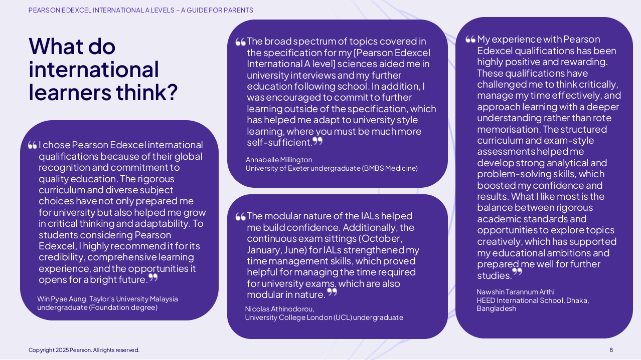 International A Levels (IAL®) are comparable to UK A Levels, as confirmed by UK NARIC, the national agency responsible for providing information and expert opinion on qualifications and skills worldwide